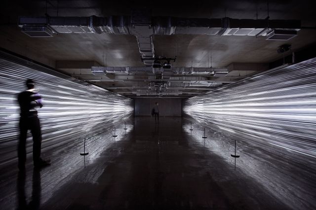 Two scenes of kevlar rope face one another tensioned to 5000kg. The audience is presented with highly parallel lines which contrast the darker space, building panoramic moiré patterns. Video projection is used to address each line with digital pixels, activating visual matter within the volume of string.