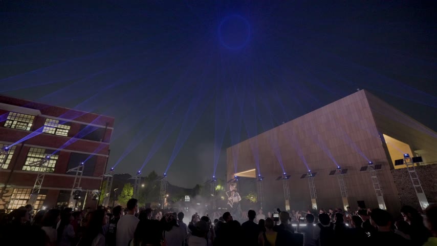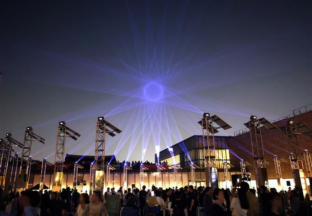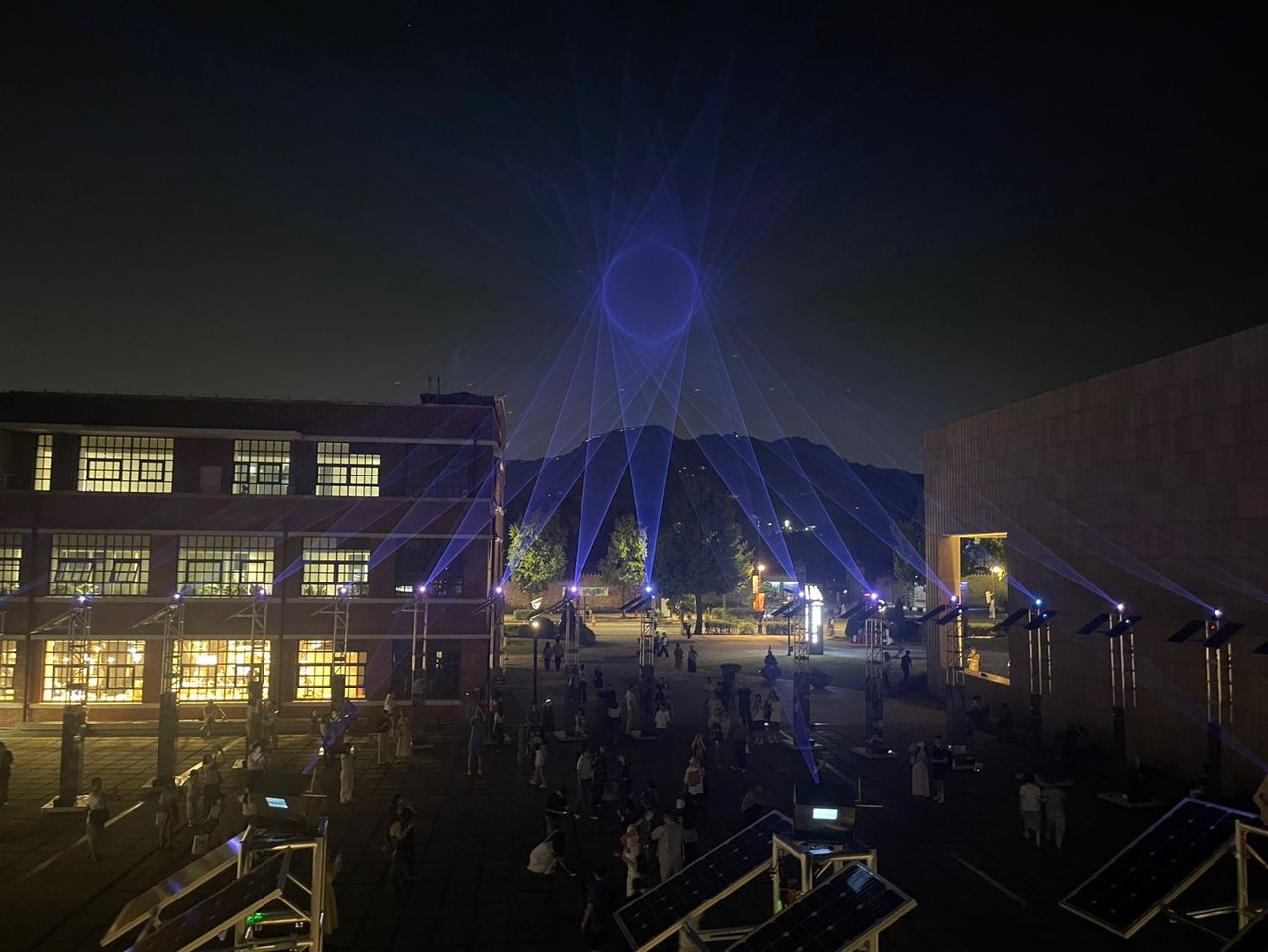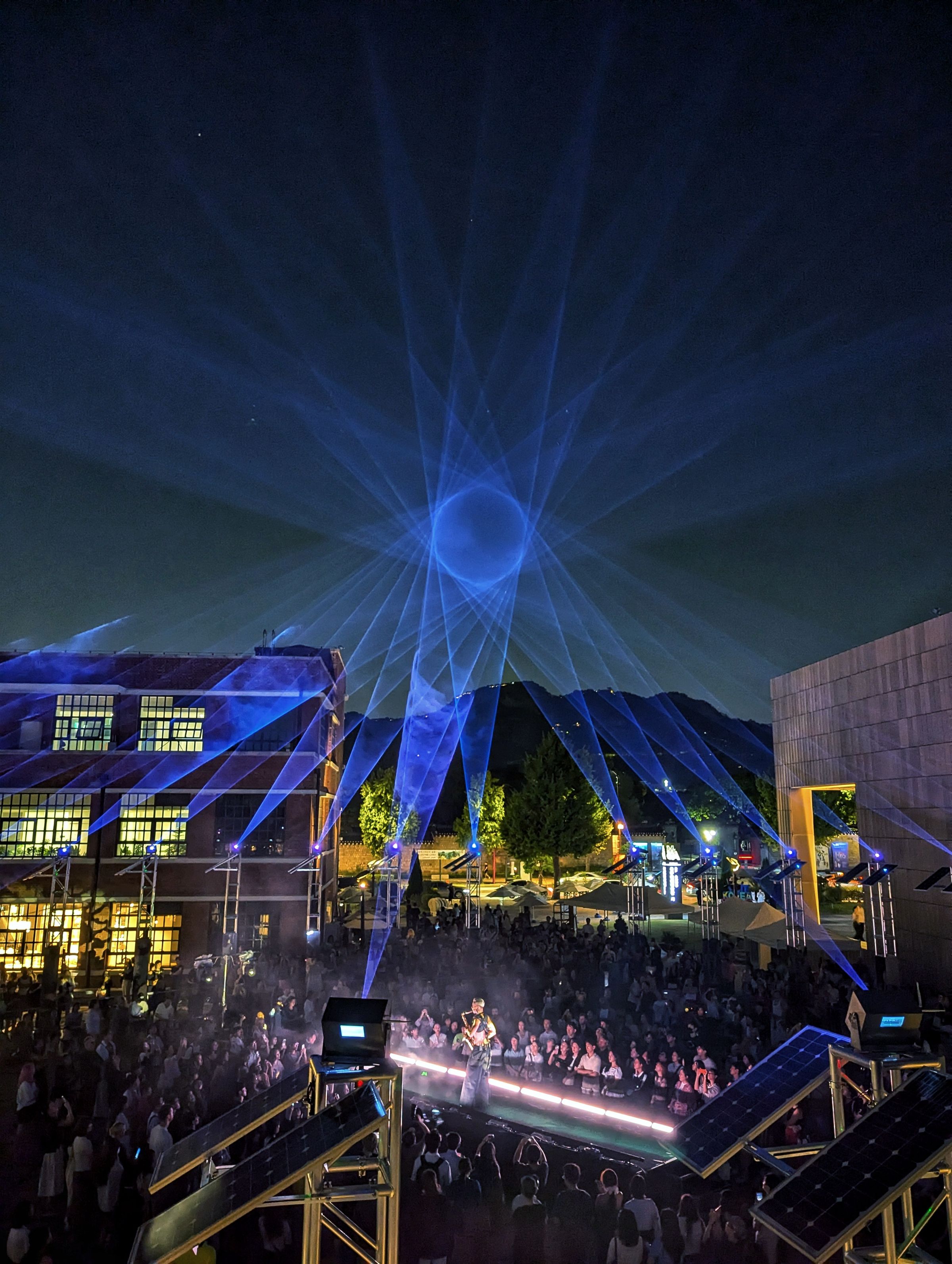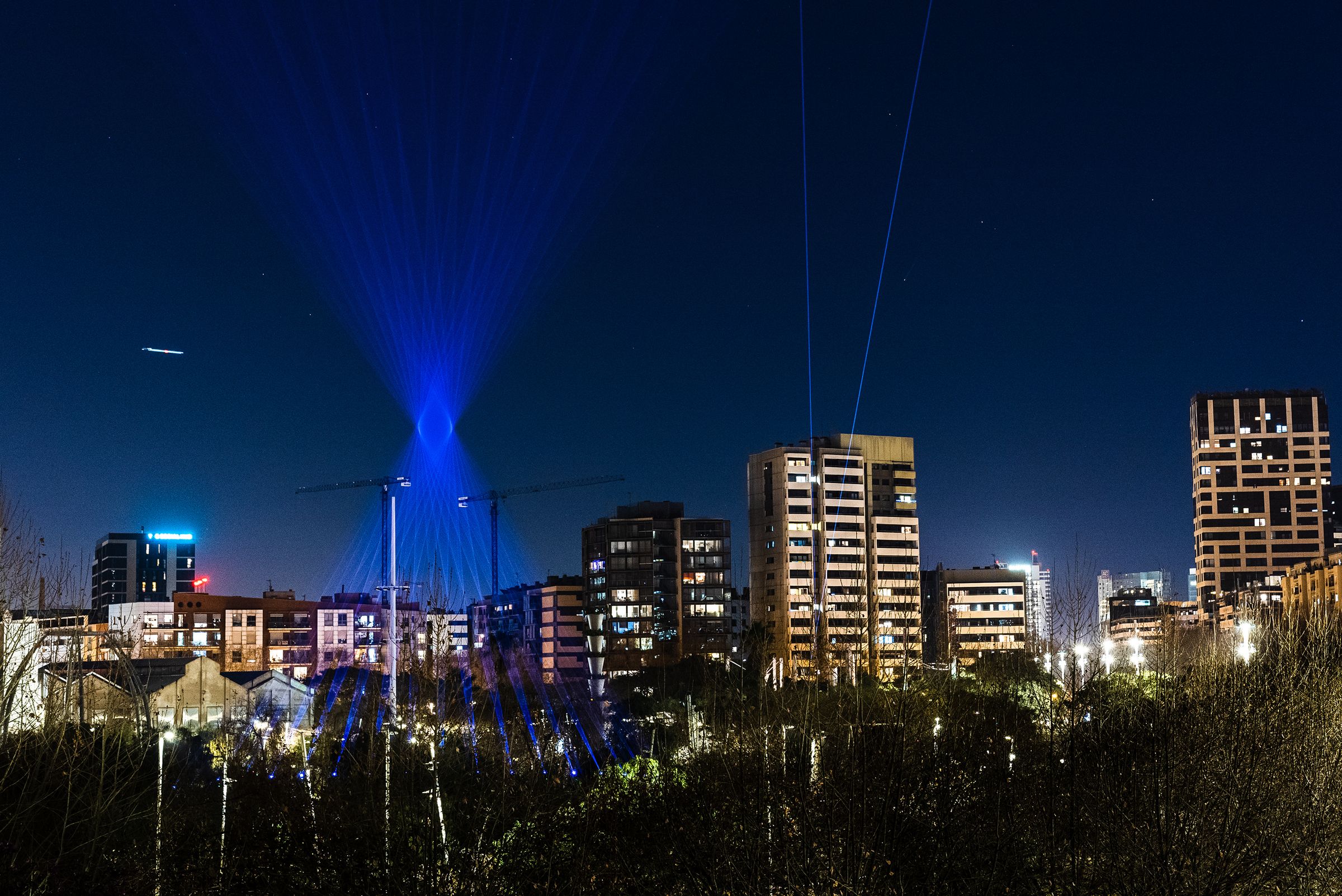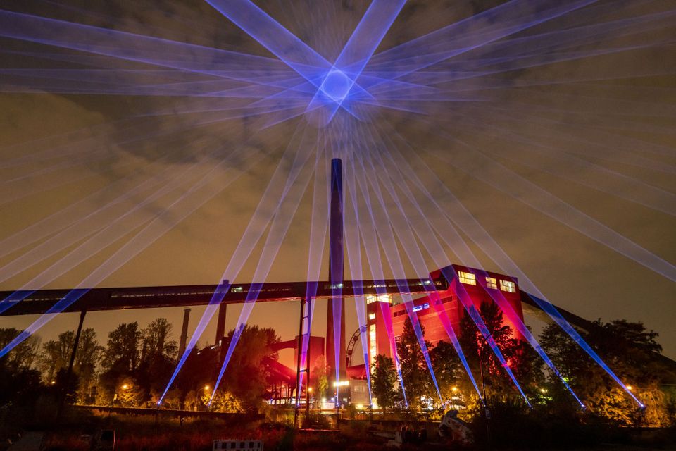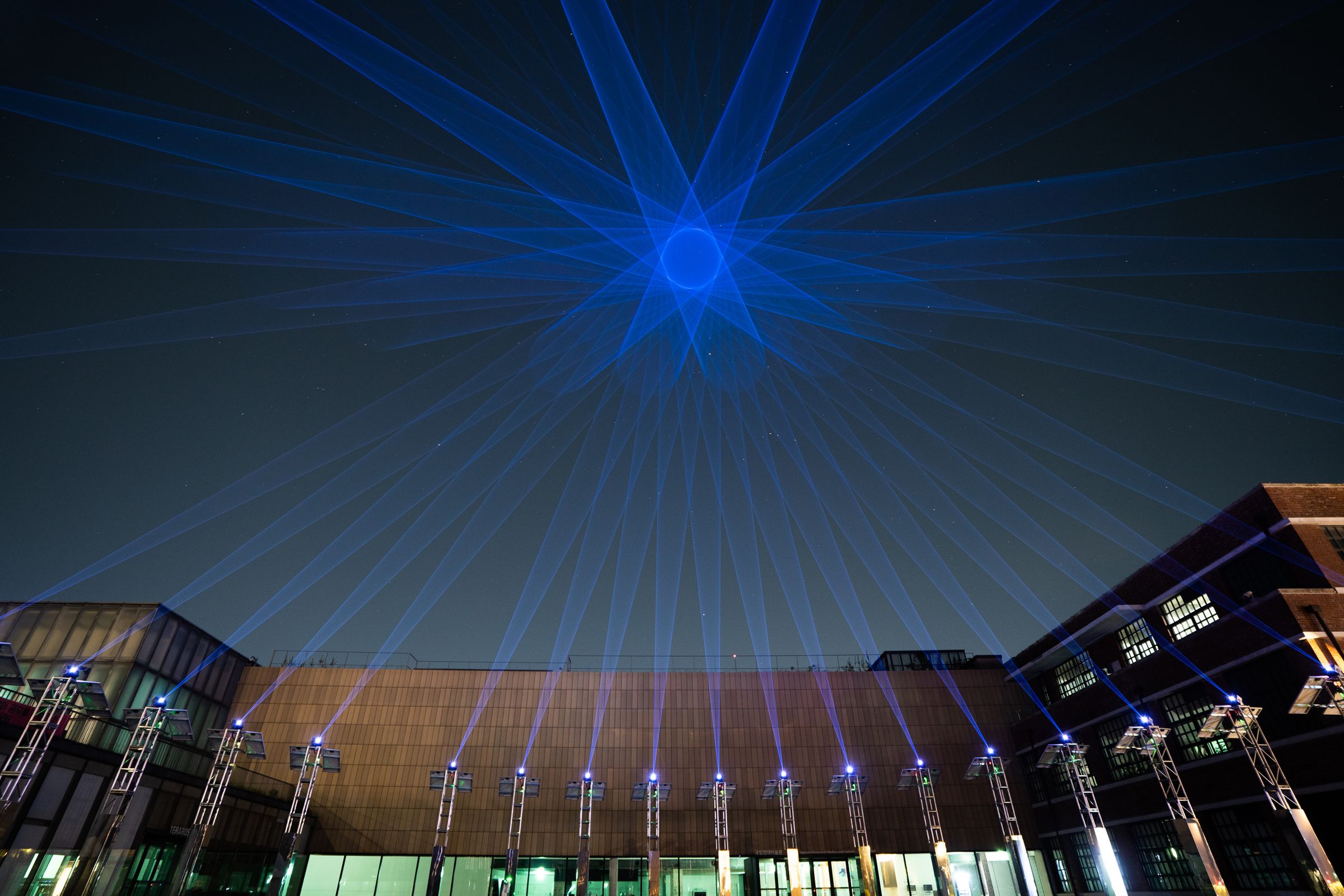 The project was first presented in the industrial ruins of the Zeche Zollverein (historically the most productive coal mine in Europe). Each night the lasers turn off one by one as the sunshine on that particular day is depleted from their batteries. This mechanism replays the ephemeral energy of the day, unwinding our on-demand instinct for energy which became dominant during the era of fossil fuels. The work proposes that our relationship with energy could be more like our relationship with internet bandwidth, where one day the energy is fast (when the sun and wind are available) and the next might be slow, and that by learning to live in this world of fast and slow energy we can significantly reduce our dependency on fossil fuels.
