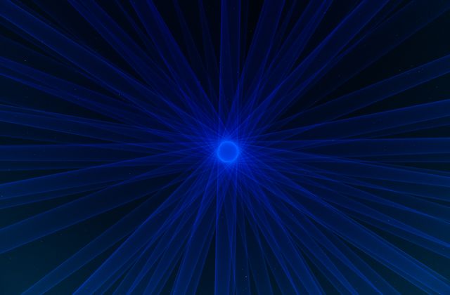 A single laser projector can render a cone of light in the sky. If these cones are aligned correctly, then the volume where they intersect will form a sphere. The light of the projectors becomes visible by scattering off of particles and humidity in the air.