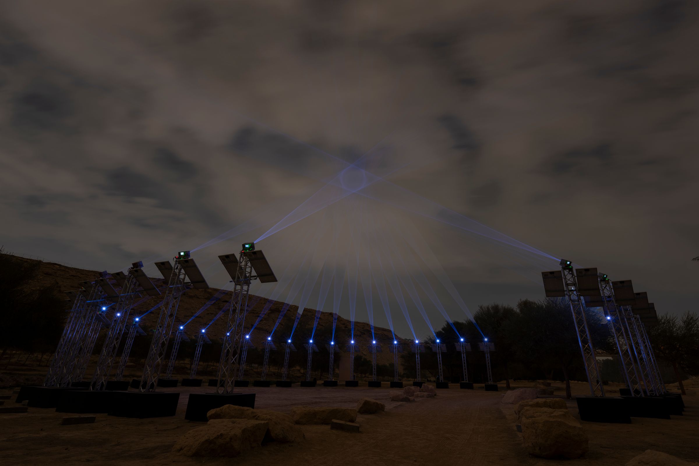 Another Moon is a large-scale outdoor apparition that creates a technically sublime second moon in the sky. As the original moon is visible as a reflection of sunlight in the sky, this second moon is created by a cross-temporal reflection of sunlight gathered during the day, projected back into the sky at night. The moon appears overhead where laser beams tightly superimpose to create a three-dimensional form that can be viewed up to 1km away. It was developed over a 6 year period by the artist duo, and is the pinnacle of their 'Drawing in the Air' series of works.
