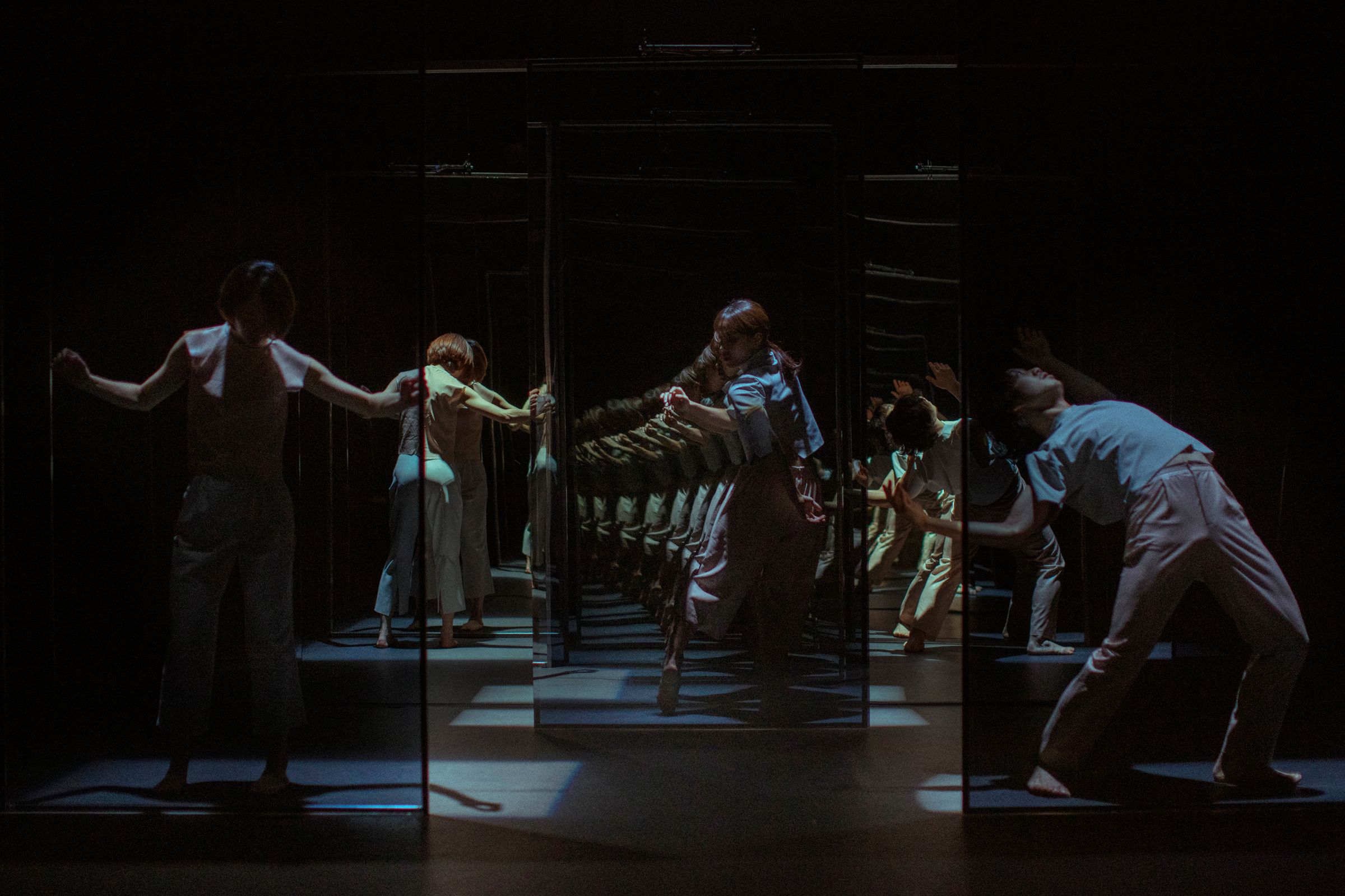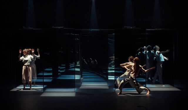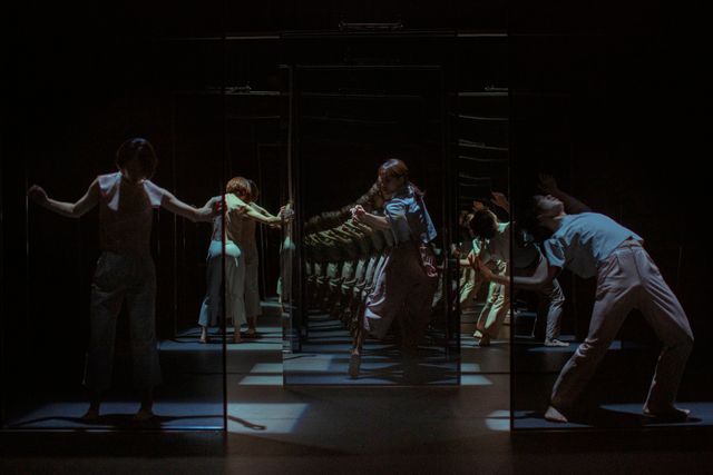 Dancers move independently in the space around the optical objects, whilst also the dancers become objects of the light and mirrors. They encounter undetermined images of themselves and others, creating accidental connections and determined relationships within the choreography.