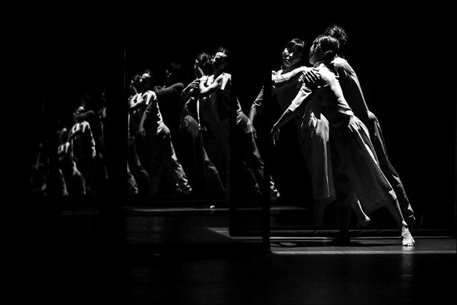 Collective Behaviour is a performance illustrating the symmetry between individual identity and collective identification. Reflective materials on the stage intervene the light, causing manipulations in space, time and the dancer's individuality. The artists use projections and reflections to distort space, expanding it infinitely, duplicating it, isolating it, and with this changing of space, consequently stretch and bend time within the performance.
