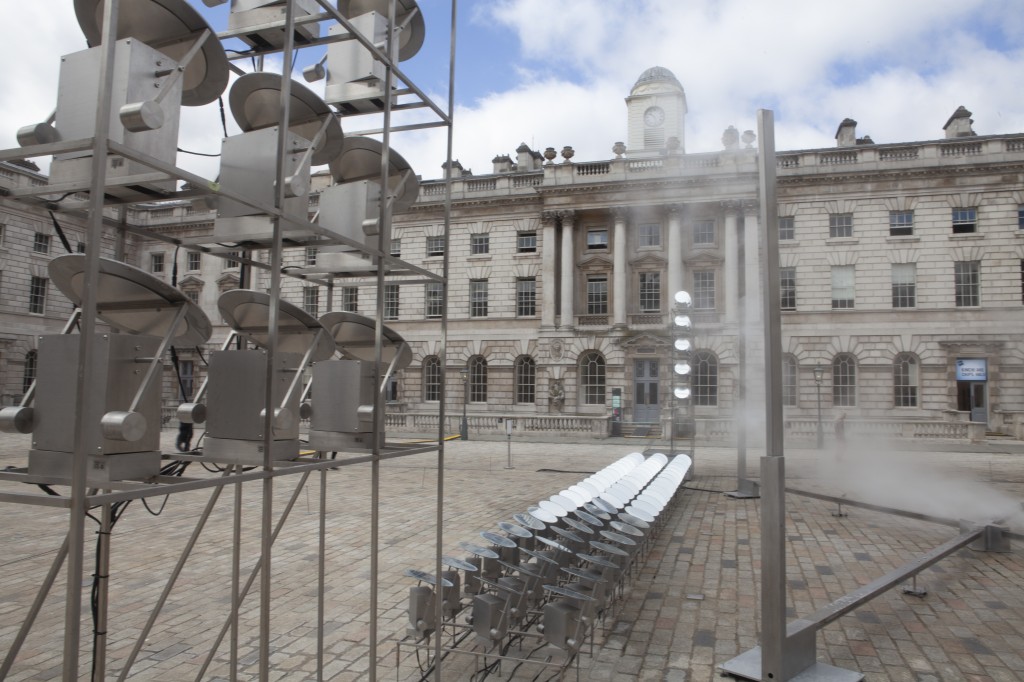 The installation superimposes diverse timescales. The sun is beyond humanity’s timeline; as the solar energy interacts with the earth, it creates the clouds which occasionally pause the installation as they shadow the mirrors; The daily passage of the sun across the sky is traced out by the mirrors moving in tandem; The sun forces the wind which, second-to-second, catches the mist and chaotically carries it into the focused sunlight, drawing the halo. The moment that Halo emerges in the air, it briefly superimposes the transience of momentary experience with the immutability of the sun.