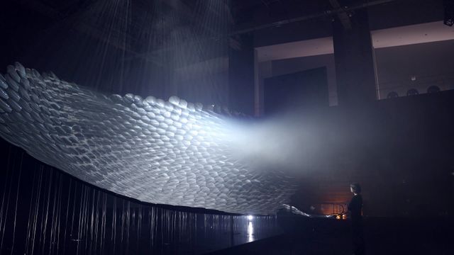 In this edition, 8 architectural video projectors are split into 630 sub-projectors using a structure of concave mirrors designed by artificial nature. Each mirror and its backing structure are computationally generated to create a group that collaborates to form the single image in the air. By accurately calibrating each of the 16,000,000 pixels individually, light beams can be merged in the haze to draw in the air. 42 channels of audio are then used to build a sound field that helps to solidify the projected phenomena in the audience's mind.