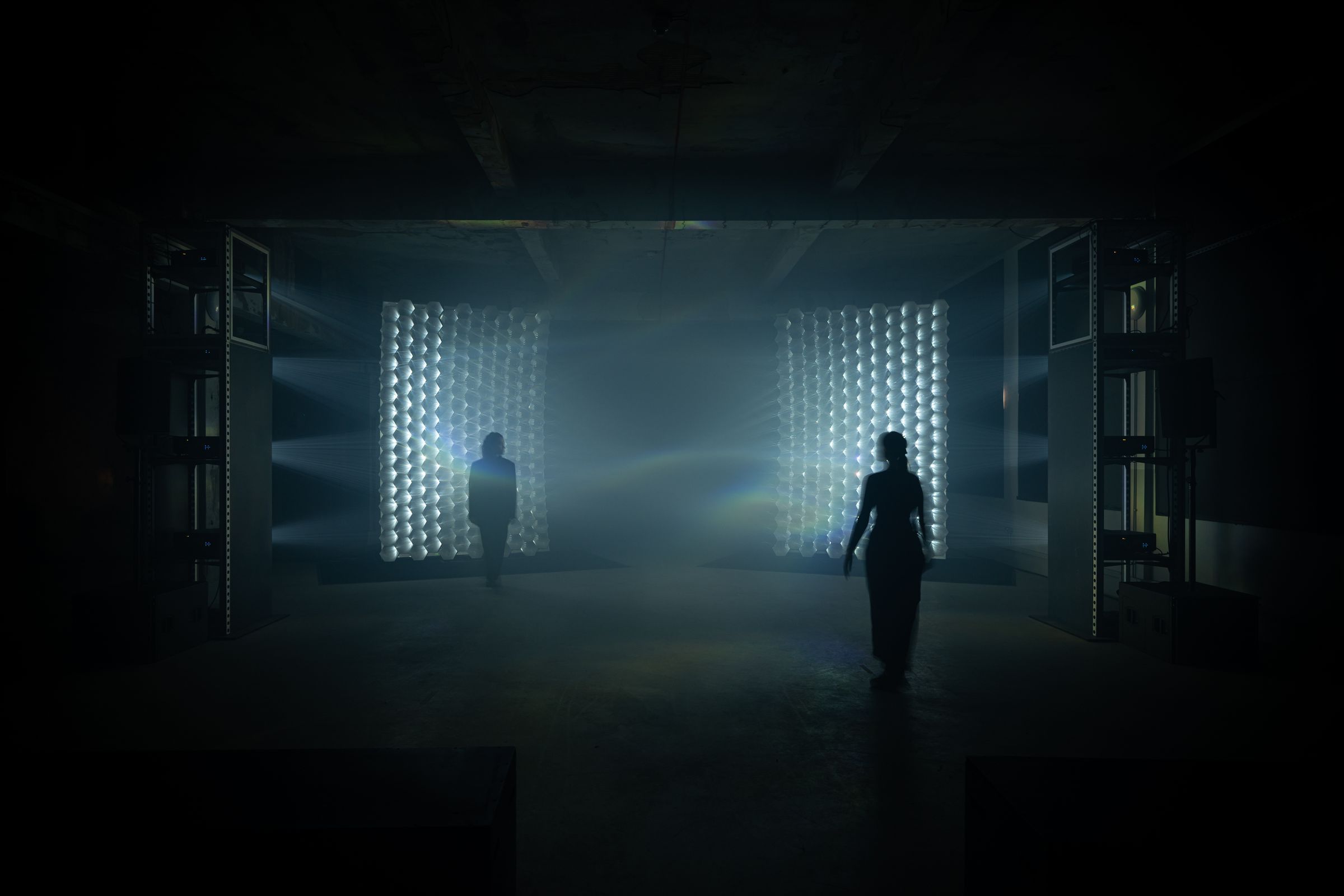 In Cyclops Retina, Kimchi and Chips and Rosa Menkman combine their contrasting research into light as both a material and neurological phenomena to create an experimental video essay presented in an experimental format. The specially commissioned narrative written and narrated by Menkman takes us on her journey into the cave of a cyclops so that she might learn how to see into the future. This journey is illustrated by millions of beams of light which are merged in the haze to create floating graphics in the air. The installation and narrative delve into unconventional modes of vision, pushing boundaries and exploring new ways of experiencing light and perception.